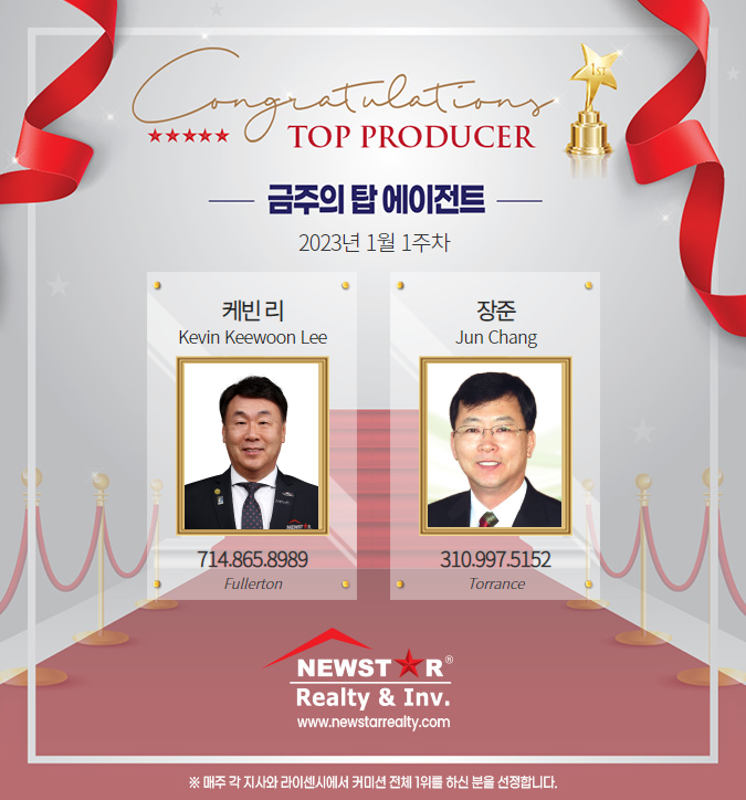 | 뉴스타 부동산-가든그로브 오피스 금주 "TOP" 에이전트 (0) | 2023.01.10 |
