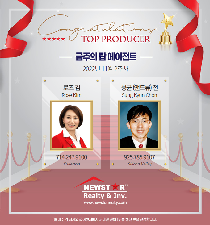 뉴스타 부동산 전체 금탑 플러튼 지사의 로즈 김 선생님! 실리콘 밸리 지사의 성균 (앤드류) 전 선생님의 "금탑"을 축하드립니다!! 선생님들의 꾸준히 빛나는 결실이 아름답습니다~! 열심히 일하는 사람이 가장 아름답다고 하는 말이 있듯이 땀흘려 수고하는 사람들이 누리는 행복은 아무나 찾아지지 않는 보석같은 것이지요. 두 분 선생님의 성실한 성장과 결실을 보면서 한 주간을 더 힘차게 시작합니다. 앞으로도 숨은 수고와 내공의 결실이 풍성하시길 바랍니다. 플러튼 지사와 실리콘 밸리 지사에서 온 반가운 소식이 뉴스타 가족에게 원기가 되어 한 주간 힘차게 뻗어갑시다! 수고 많이 하셨습니다. 감사합니다! 미국 뉴스 2022.11.22